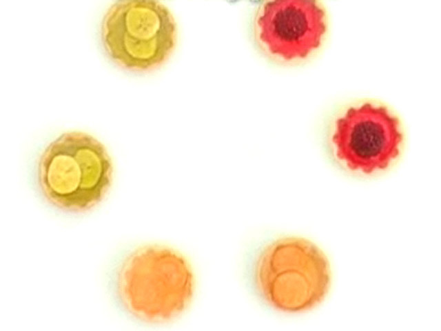 Рецепт тарталеток с желе.Состав: тарталетки — 6 штук;банан — 1 штука;физалисы — 4 ягоды;малина — 2 ягоды;желатин киви, желатин малиновый, желатин ананасовый, вода.