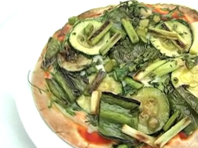 Рецепт вегетарианской пиццы.Состав:перец — 1/2;молодой чеснок — 6 стеблей;тмин — 2 веточки;кабачок — 1 штука;спаржа, хлеб, сыр, руккола, соль, оливковое масло, томатный соус.
