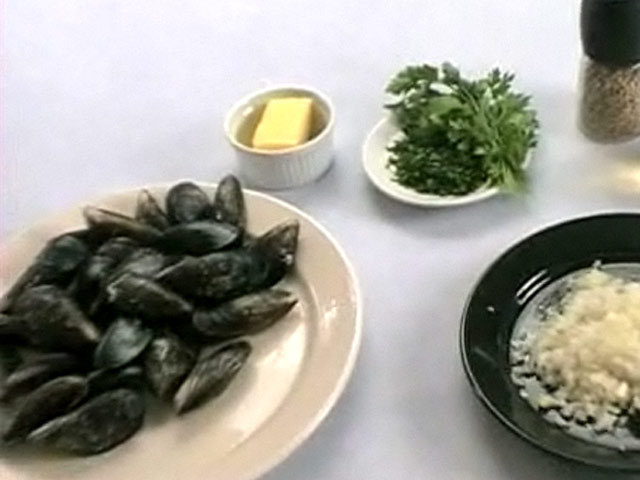 Рецепт приготовления мидий по-флотски.Состав:мидии — 20 штук;масло — 50 гр;петрушка — 1 пучок;лук — 1 штука;белый перец, белое вино.