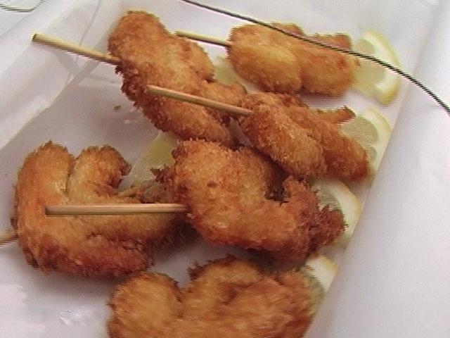 Пикник высшего света с креветками в сухарях.Состав:креветки — 12 штук;яйцо — 1 штука;сухари — 90 гр;мука — 50 гр;вода — 1 столовая ложка;лимон — 3 дольки;соль, оливковое масло — по вкусу.